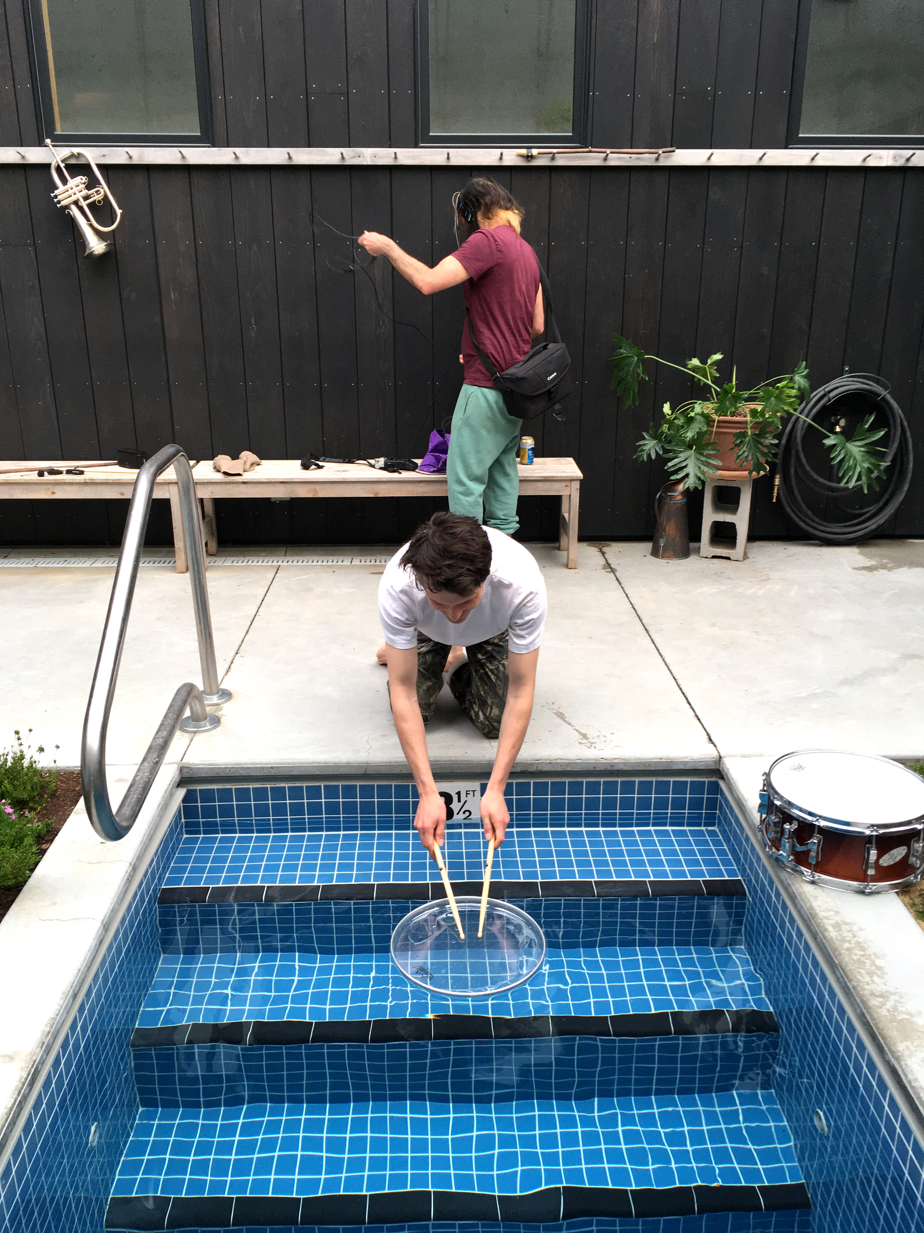 We also made versions of our instruments that could withtand the temperature and humidity fluctuations of the baths, and played them live in certain spaces throughout the day. Sometimes a flute would sound in the sauna, a drum might drip its way out of the plunge, a duet of wind instruments howled from the rooftops, or a rogue singer would double up on the harmonics of the showers to hilight the room tone. Some attendees seemed unfazed, some seemed to drop in to the waves.